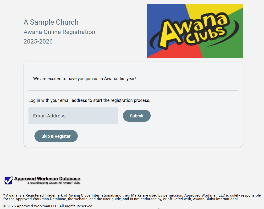 Note: If an invalid customer number and/or code is used in the Online Registration site, this message is shown: Ask your Awana leader for the registration link specific to your church in order to register online.