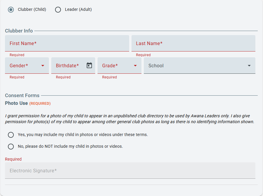 - If no matching email address is found, information can be entered to register clubbers or leaders. As long as the Log-in Email address is used in the registration form, the household list of members will be created and shown as described above.