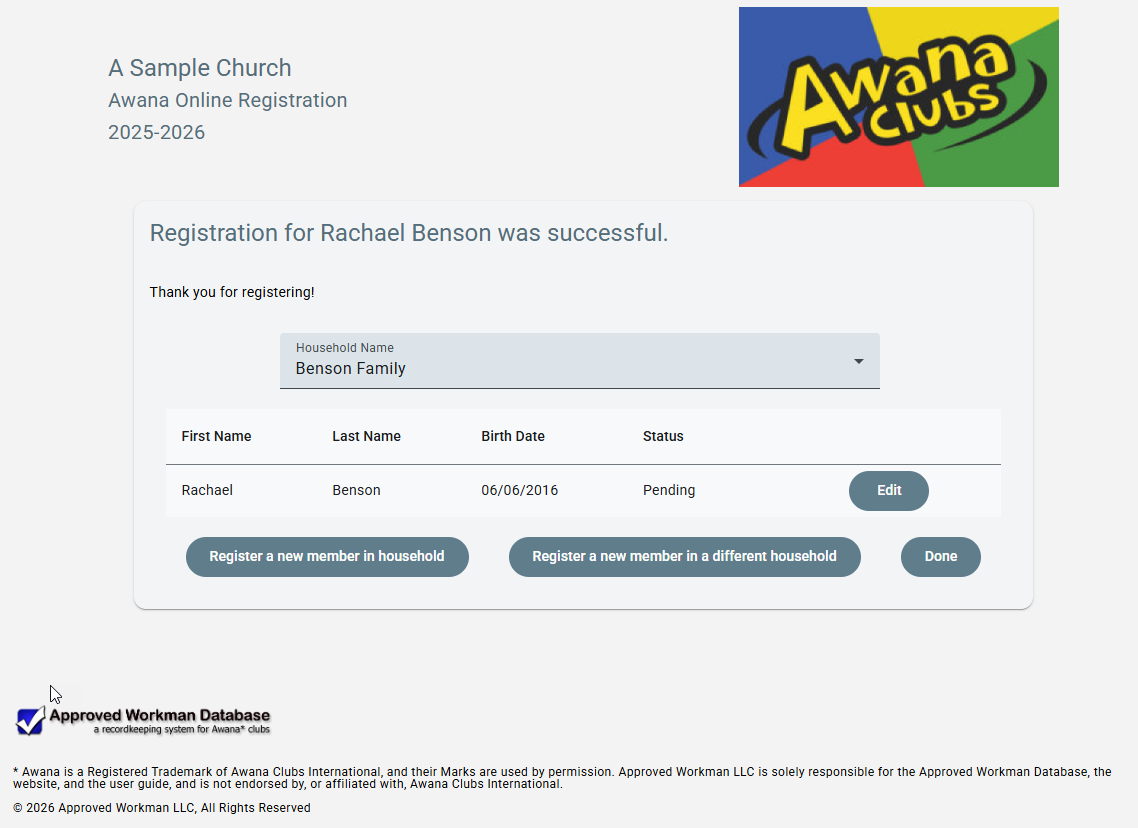 - If a matching email address is found in the database, a list of members with primary associations to the matched household will be shown along with the status of the member and options to Edit a pending registration, Register a member, or Add a new member. When registering an existing member, the person's member details will be filled into the form. For all members, the household details will be filled into the form. Contacts are also shown with an option to Delete those that are no longer current.